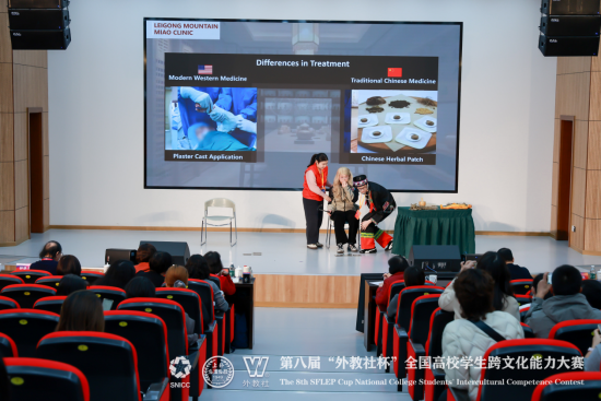 我校“Miao-tivators” 代表队由23 级临床医学专业胡湘婷、陈浩聪和23 级英语专业郑睿三位同学组成。在全国决赛的舞台上,赛事涵盖案例开发与分析、名言名句解读、知识问答等多个核心环节,考察维度全面且极具挑战性。三位同学延续省赛优势,巧妙融合医学专业知识与跨文化交际理论,以“苗寨医疗场景中的跨文化融合” 为核心展示方向,通过流利的英语表达、严谨的逻辑论证、真挚的情感传递和自信沉稳的现场应变,生动诠释了传统中医与现代西医在跨文化语境下的碰撞与共生,展现了当代医学生兼具家国情怀与全球视野的复合型人才素养,赢得了评委们的高度认可。