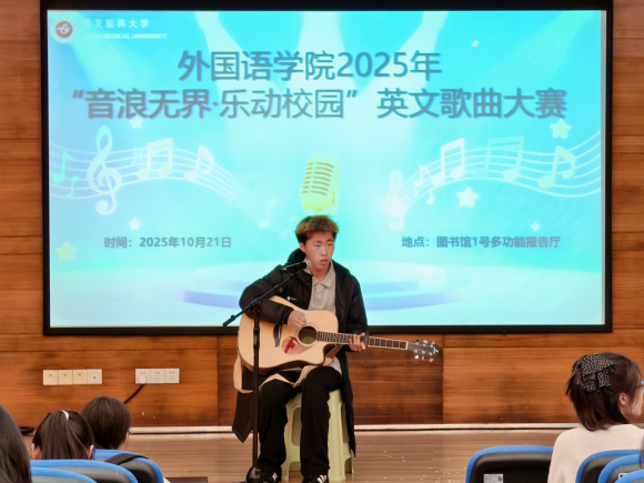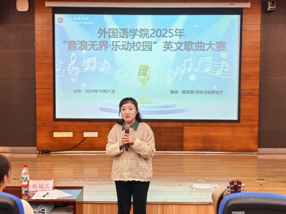 为丰富校园文化生活,激发学生英语学习热情,给同学们提供展现音乐才华的平台。2025年10月21日16:00,yL23411永利于图书馆1号多功能报告厅成功举办了2025 年“音浪无界・悦动校园”英文歌曲大赛院赛。比赛邀请了永利yl23411官网统战部副部长李菲、yL23411永利党委副书记唐茜、学生处思政科科长,校音乐协会指导老师吴虞娱、yL23411永利综合英语教研室副教授秦雪飞、yL23411永利团委负责人郑婉萍担任此次比赛的评委,20支队伍参加比赛。
