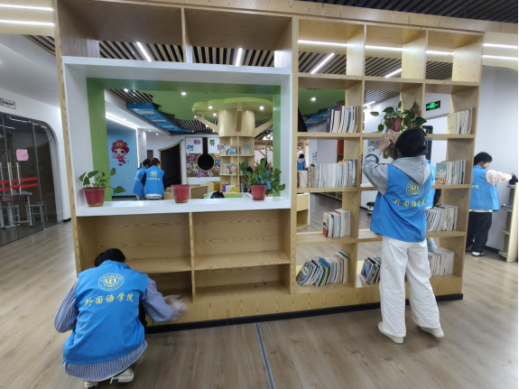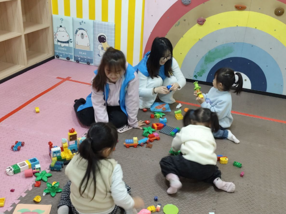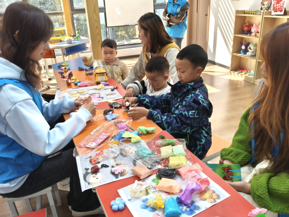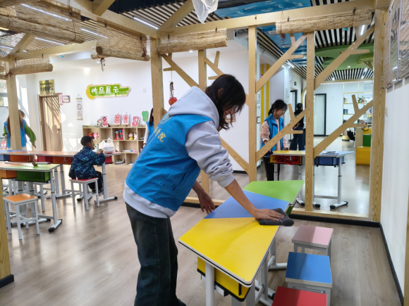 活动伊始,同学们迅速投入社区“尊享童年”活动室的卫生清洁工作:大家分工协作,擦拭桌椅、整理书架、清扫地面死角,短短半小时便让活动室焕然一新。待小朋友们陆续抵达,趣味互动环节正式开启:在积木搭建活动中,志愿者与小朋友们共同合作,搭建了农场、城堡等丰富的造型,并给予他们鼓励和支持;在黏土创意制作活动中,志愿者向小朋友们示范揉、捏、塑形等基础技巧后,小朋友们则发挥想象力创作:长了翅膀的汽车、有尾巴的机器人、五彩斑斓的毛毛虫……在志愿者的协助下,小朋友们创造着属于自己的黏土世界,形态各异的作品让现场充满欢声笑语。